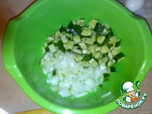 • 1. Лук почистить, порезать посолить и обдать кипятком дать остыть. Добавить мелко нарезанные огурчики.