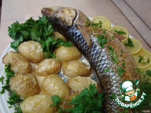 На смазанный растительным маслом противень выложить рыбу, смазать ее майонезом. По бокам от рыбы выложить картофель. Запекать в духовке 30-40 мин. (Этот момент я забыла сфоткать). Достаем нашу рыбу с картофелем из духовки, выкладываем на блюдо и украшаем зеленью и лимоном. Рыбу перед подачей сбрызнуть лимоном.