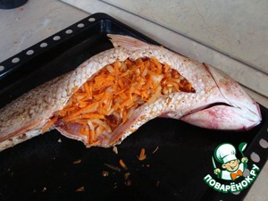 Подготовленную рыбу наполнить тушенной морковью с луком. Зашить брюшко у рыбы.