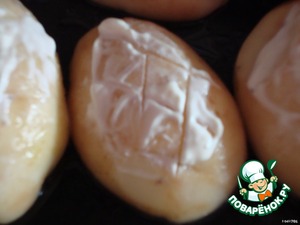 Почистить картофель (молодой), разрезать вдоль на 2 части. Сделать на картошке надрезы в виде сеточки, посолить, смазать майонезом.