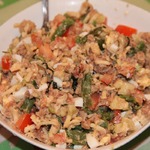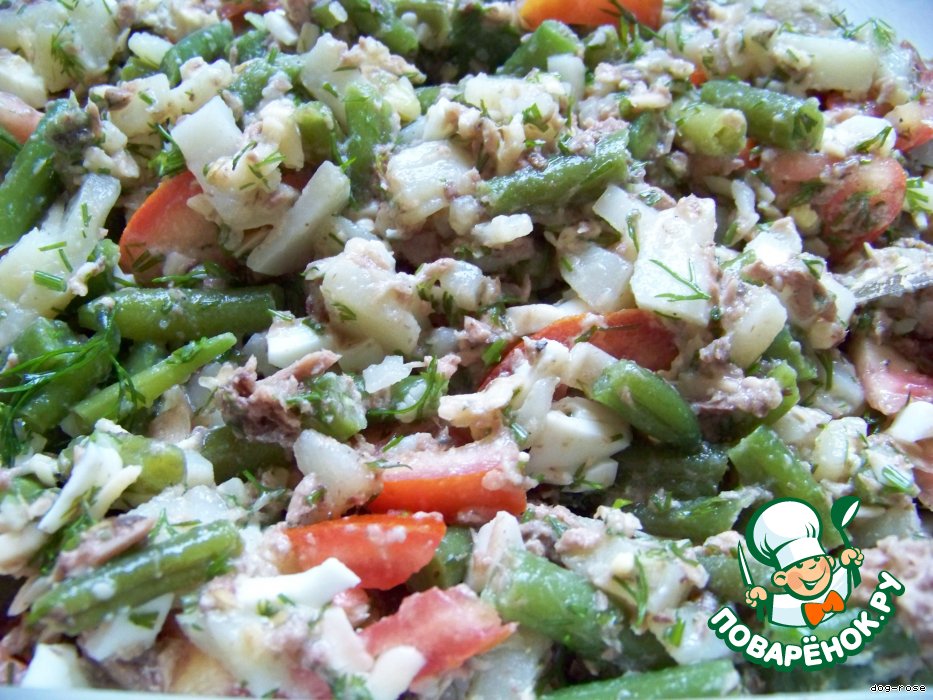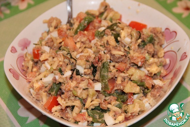 Дальше режем все продукты, кроме фасоли, сыр мне больше нравится натереть на терке, тунца разминаем вилкой. Если салат не предполагается съесть сразу же, сливаем сок с тунца, так как помидоры тоже дадут сок.