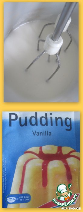 Смешать творог, сметану, сухой пудинг, размягченное масло, сахар, желтки, ванильный сахар Продолжая взбивать понемногу влить молоко до получения однородной достаточно жидкой массы.