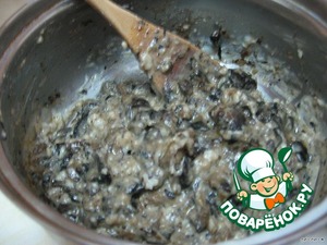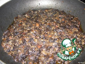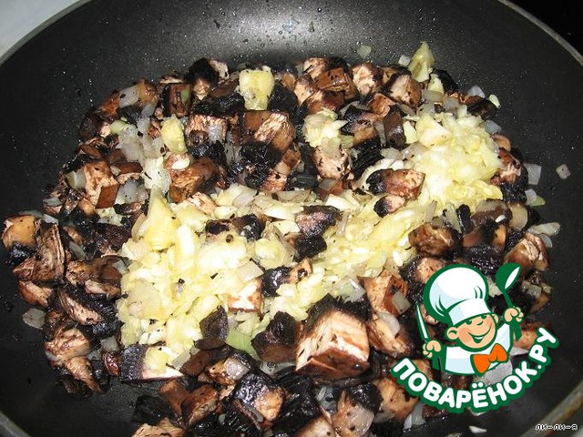 Лук мелко нарезать и обжарить до прозрачности. Добавить к луку грибы, половину мякоти кабачков, соль, перец и орегано.