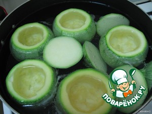 Опустить кабачки и крышечки в кипящую, подсоленную воду и варить 10 минут.