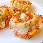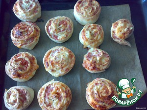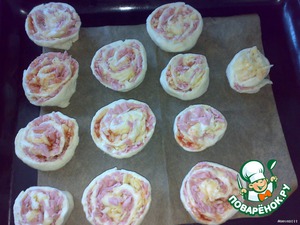 Нарезаем наш рулет на кусочки. Каждый кусочек разравниваем. Получаются розочки. Выкладываем на противень. И ставим в разогретую до 180 гр. духовку на 25мин.