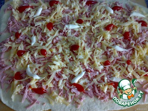 Тесто раскатываем в прямоугольный пласт. Разравниваем нашу начинку. Сверху прокапываем майонезом и кетчупом. -