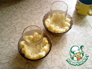 Смазываем маслом миску-купол (чем она больше - тем лучше). Выложим дно миски соцветиями капусты. На средину миски ставим стакан и вокруг него размещаем капусту в несколько слоёв, оставляя 2 см от верхнего края мисочки. оставляя -