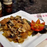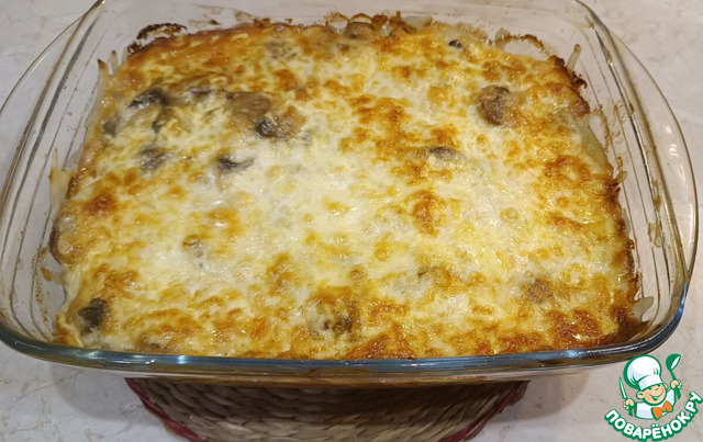 Нарезаем грибы, также обмазываем их перцем, солью и майонезом и выкладываем сверху картофеля.