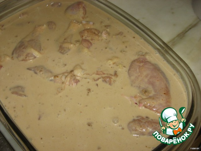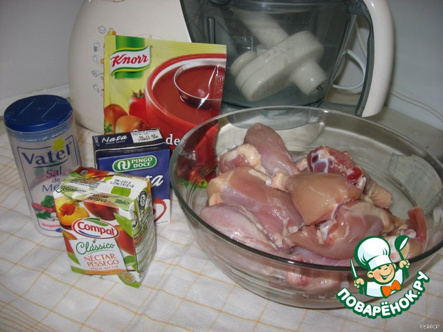 Куриные окорочка разрезать на 2 части, и обычно я снимаю кожицу (по желанию). Заливаем персиковым нектаром и сливками. Перемешать