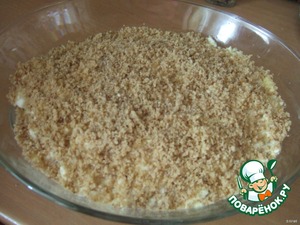 Теперь завершающий слой - грецкий орех (орех очень хорошо перемолоть). Теперь накройте пищевой пленочкой и в холодильник…