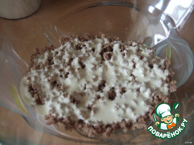 Потом выкладываем оставшийся фарш и засыпаем яичной крошкой. Все еще раз хорошо поливаем соусом.