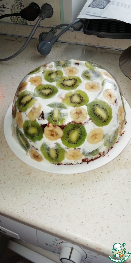 Все что у нас получилось заливаем кремом и ставим в холодильник на 1.5-2 часа до застывания. Застывший тортик переворачиваем на блюдо (для этого ритуала я пригласила соседку т.к думала что не перевернется,перевернулся очень легко). Все! Приятного аппетита!!!!