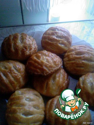 Разогреваем духовку до 170 градусов. Выкладываем на противень меньшие круги. Теперь на них положим по 1 ст. л. фруктовой массы. Смачиваем их края водой, сверху положим сетчатые кружочки и хорошо прижимаем. Оставляем слойки на 20 минут.