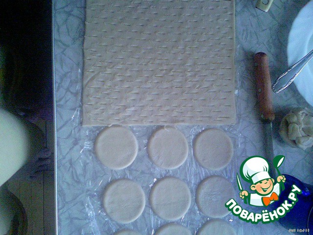 Раскатываем тесто в лист толщиной 6 мм. Теперь формочкой (стаканом) с небольшим диаметром 9приблизительно в 7 см)вырезаем из половины теста кружки.