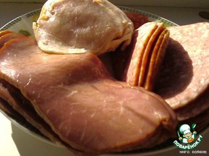 - Мясо (копчёности, можно взять любые, но экономить не надо, иначе получится не так вкусно) — 600 г