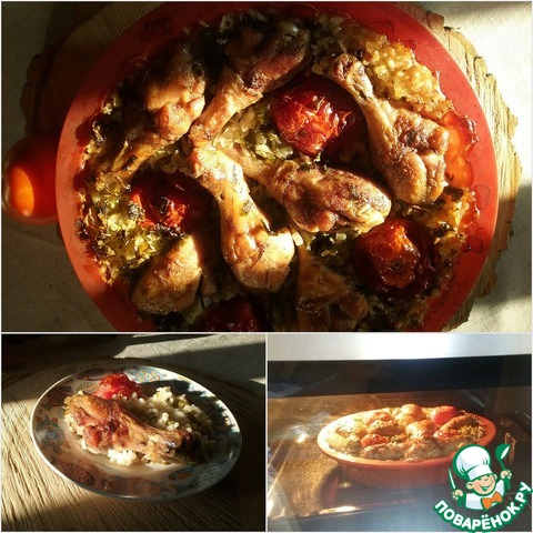 Огнеупорную форму смазать маслом, выложить в нее рис. Равномерно распределить помидоры (целиком).