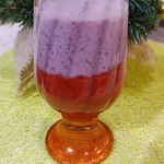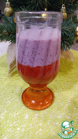 ... кефир тоже взбиваем с сахаром и черникой или просто берем черничный йогурт. Осторожно наливаем поверх клубники черничную смесь, льем медленно и осторожно на ложку, прислонив к стенке, чтобы слои не перемешались...