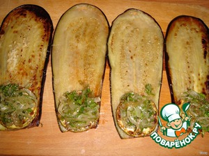 Баклажан нарезать вдоль тонкими ломтиками, посолить, выдержать 30 минут. Отжать и обсушить.