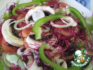 Сверху - тонкие полукольца очищенного салатного перца и проростки.
