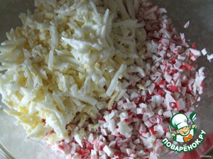 Яйца отварить, почистить и потереть на крупной терке. Крабовое мясо мелко порезать.