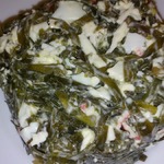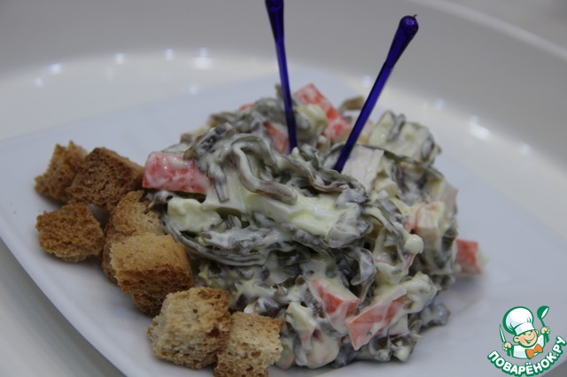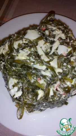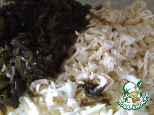 Если делать из сухой морской капусты, то ее нужно промыть и на ночь замочить (часов на 8-12), потом промыть, закипятить воду в кастрюле по объему раза в два больше капусты (при варке она поднимается), и в горячую воду ее положить, варить 30 минут, добавить соль (полдесертной ложки на 1кг капусты), иначе после варки она будет пресной. Лучше и сырок, и яйца тереть на мелкой терке, причем сырок вначале, а яйца потом, т. к. после яиц терка лучше моется, чем после сырка.