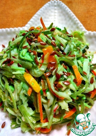 [+5]Моя капуста - морские водоросли Ундария, нашинкованы узкими полосками. От себя добавила белый лук (нарезан перьями) и свежую морковь, которую также нашинковала брусочками. Из яиц сделала глазунью и тоже порезала полосками. Сыр - копченый.