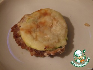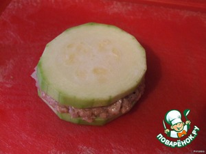 Берем кружочек кабачка, кладем на него фарш и закрываем другим кружочком кабачка.