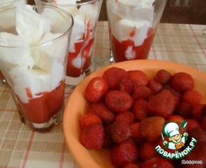 Наливаем клубничную массу на дно бокалов, сверху кладем маскарпоне, примерно по 5 столовых ложек, накрываем сливочный сыр пломбиром