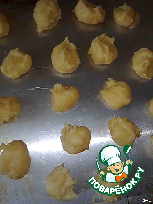 Всё это дело можно выложить в кондитерский мешок, а можно, и это будет проще, взять ложку и выложить шарики размером чуть больше грецкого ореха на противень.