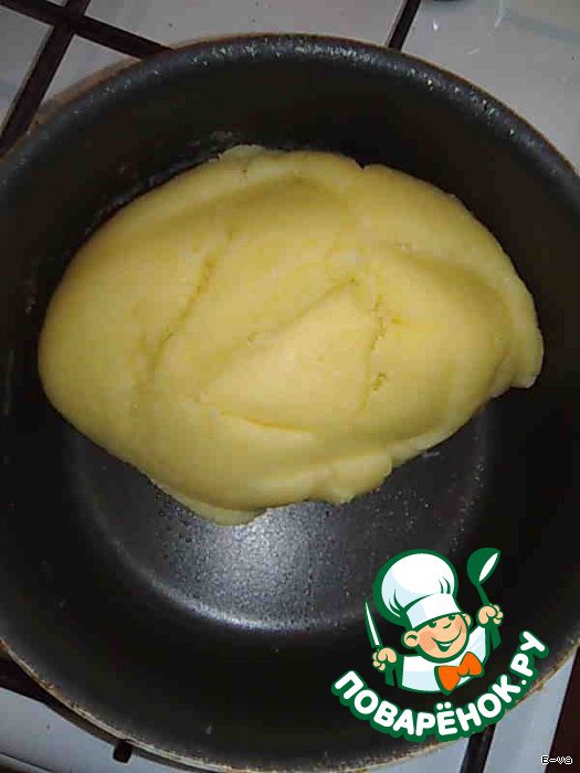 Сразу же, как закипит, высыпаем всю муку и интенсивно замешиваем лопаточкой, чтобы не было комков. Всё это варим и хорошо мешаем, пока тесто легко не будет отходить от стенок посуды и принимать шарообразную форму.