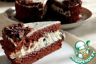 По рецепту нужно намазать 1/3 сливок на нижний корж. 2/3 сливок намазать на верхний корж и по бокам. Посыпать какао.