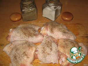 Куриные бедрышки помыть, обсушить, натереть солью и перцем. Сложить в глубокую посудину.