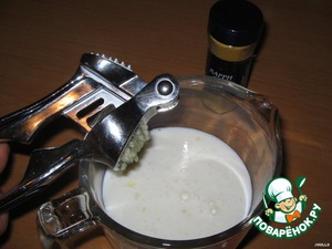 В кефир выдавить чеснок, добавить соль и порошок карри (в зависимости от того острый или нет). Хорошенько перемешать.
