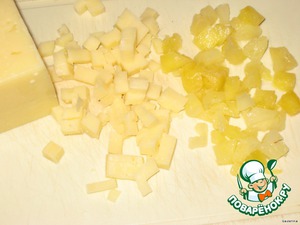 Свежий или замороженный (разморозить) ананас порезать маленькими кубиками.