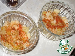 На дно формочек выложить ананас и сыр, сверху присыпать перцами и паприкой.