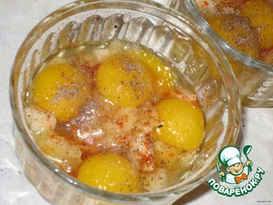Затем поверх сыра с ананасами разбить 1 куриное яйцо, его тоже поперчить и посолить.