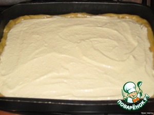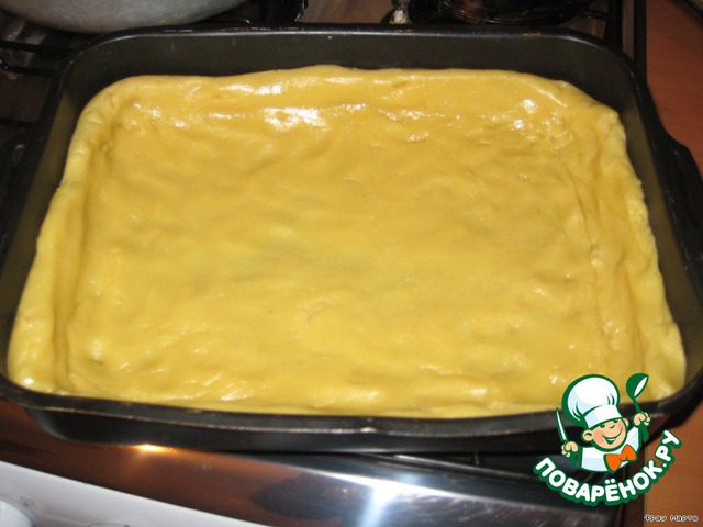 Взять форму и разровнять тесто по форме руками, при этом оставить бортики.