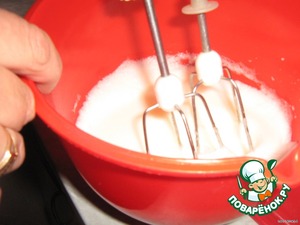 Соединить пюре и белки, взбить. Не прекращая взбивания, влить тонкой струйкой растворённый горячий желатин и взбивать ещё 2 мин.