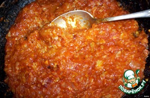 - добавить мелко порезанную луковицу (100г.), томатную пасту (2ст. ложки), сахарный песок (1ст. ложку), соль, перец