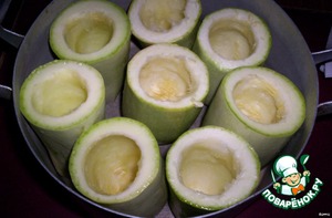 - нафаршировать кабачки мясом, луком, морковью, перцем кабачки, на дно кастрюли налить горячей воды (4 -5 см. ), посолить поперчить.