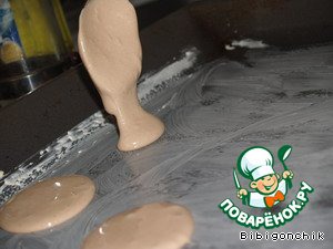 Взбить яйца с 2,5 стаканами сахара. Добавить какао, соду и муку. Тесто должно быть в виде густой сметаны.