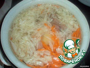 Итак: вначале варим мясо, когда мяско почти готово добавляем к нему нашинкованную капусту, порезанную кубиками картошечку, морковку, лук (можно морковку и лук спассеровать, но я для овощного супа этого не делаю) и варим до готовности. Ну естественно, солим, перчим, добавляем любимые приправки. -