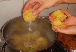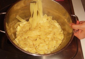 Как только феттучини готовы, отбрасываем их на дуршлаг и в течение нескольких секунд даём стечь воде...