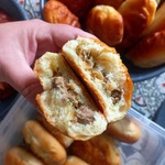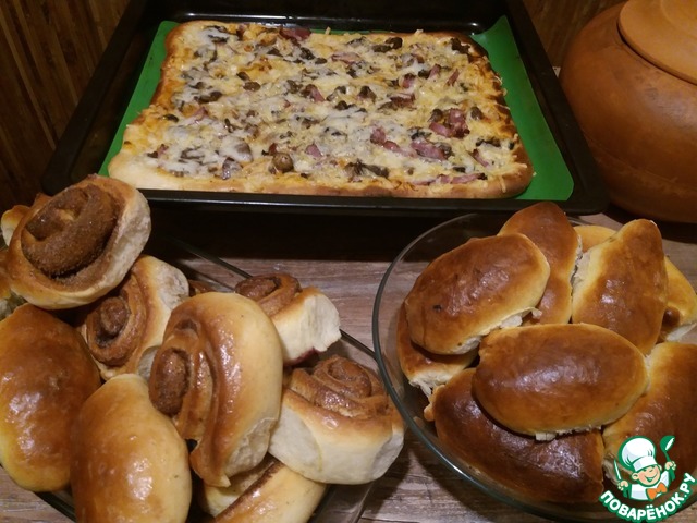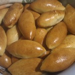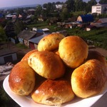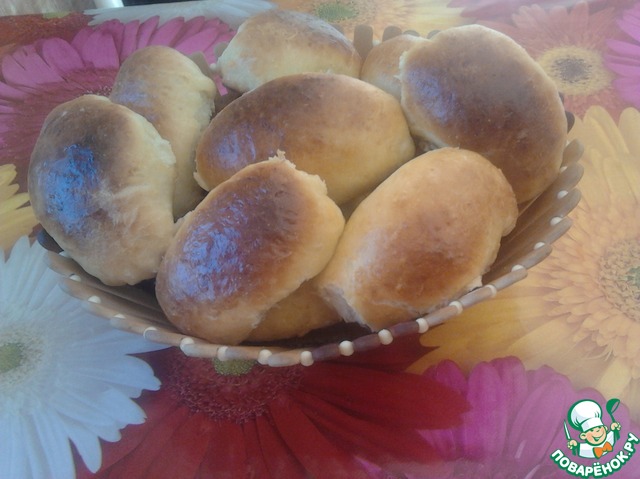 [+5]У меня три начинки: клубничное варенье, куриный фарш+лук пережаренные с зеленью, творог+сыр+сосиски+соль+укроп. Все хороши! По кол-ву вышло 15 куриных, 15 сладких и 12 сырных. Тесто делила ~55-60гр. Это средний размер пирожка, с ладошку.