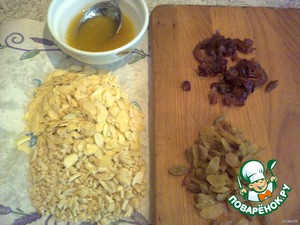 После звукового сигнала (через 22 минуты) добавить мед, миндаль, дробленый фундук, изюм и мелко нарезанные финики (косточку вынуть)