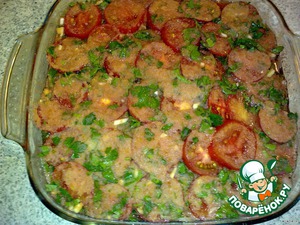 Остатки смеси сухарей, равномерно распределяем и выливаем вторую половину соуса