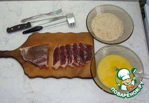 Подмороженную (это надо для лучшего отбивания мяса) утиную грудку порезать на порционные кусочки.