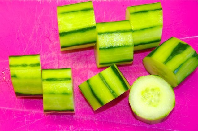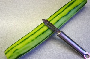 Моем и отчищаем от шкурки огурец. У меня один большой, в наших краях маленькие огурцы большая редкость...