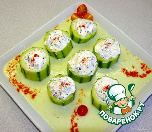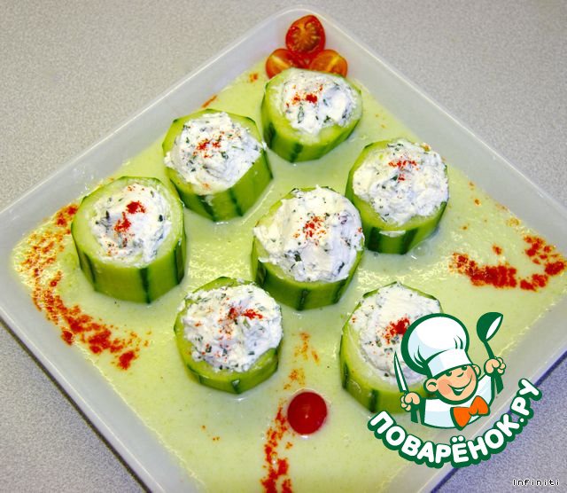 Укладываем наши огурцы в тарелку, заливаем соусом и украшаем. До подачи на стол ставим в холодильник.