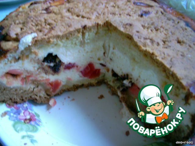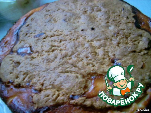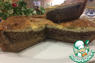 Отправляем в духовку, печем при температуре около 180 град. Минут 40 – 70 (у кого какая духовка и какая форма, у меня получился толстый слой, поэтому пекла 1 час 20 минут, в плохой духовке). Получается вот такой пирог. Приятного аппетита!